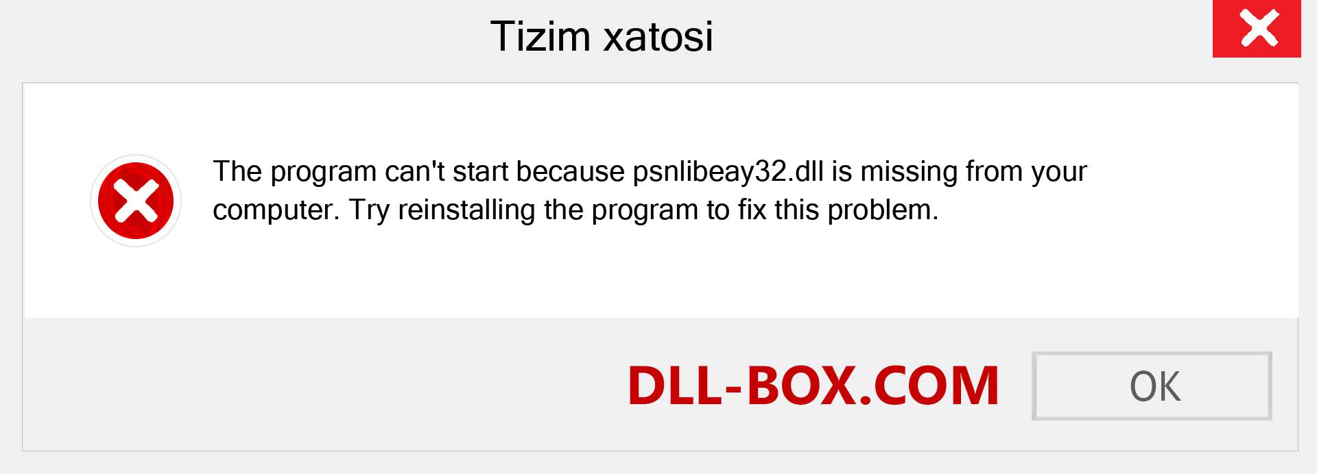 1. Dasturni ishga tushirib bo'lmaydi, chunki psnlibeay32.dll kompyuteringizda yo'q. Ushbu muammoni hal qilish uchun dasturni qayta o'rnatishga harakat qiling.